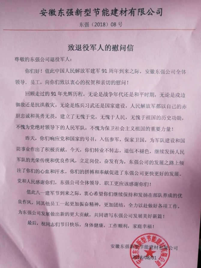 今天迎來中國人民解放軍建軍91周年,安徽東強公司全體領導、員工,向祖國最親愛的子弟兵致以衷心的祝福,同時向公司退伍軍人表達親切的慰問。