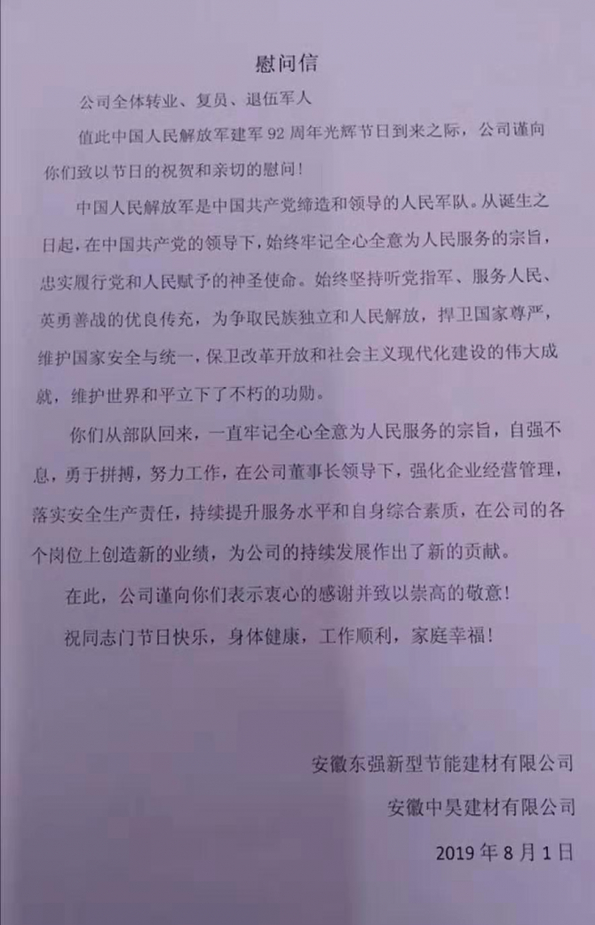 2019年8月1日迎來中國人民解放軍建軍92周年,公司全體領(lǐng)導(dǎo)、員工,向祖國最親愛的子弟兵致以衷心的祝福,同時(shí)向公司退伍軍人表達(dá)親切的慰問。
